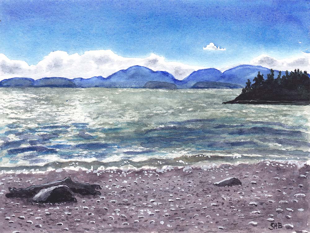 Suzanne Becque lives on Hancock Point. She is inspired by her surroundings, nature, trees, the ocean and magical views of the islands. She occasionally spends time in Mexico, and her work includes a few paintings of saints and angels influenced by her travels there.